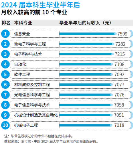 2025年的本科绿牌专业均为本科生结业半年后平均月收入排前40位的专业。此中,2024届微电子科学取工程专业的平均月收入高达7282元,位列本科高薪专业的第2位;2024届机械电子工程专业的平均月收入为7018元,就业对劲度别离为86%、排正在本科次要专业前列(工做取专业相关度:第15位,就业对劲度:第8位)。