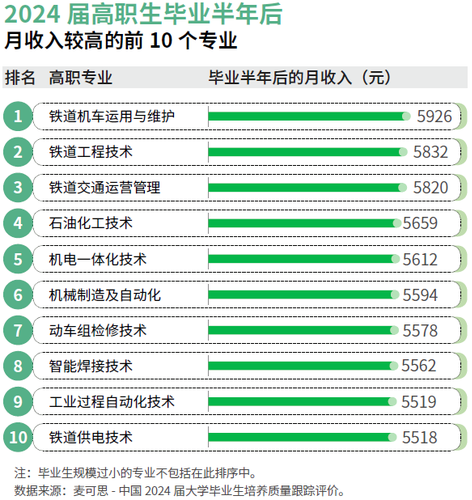 2025年的高职绿牌专业均为高职生结业半年后平均月收入排前30位的专业。此中,2024届铁道机车使用取专业的平均月收入为5926元,就业对劲度为85%,工做取专业相关度为84%,别离位列高职次要专业的第1、第7、第7位;2024届使用化工手艺专业的平均月收入为5481元,工做取专业相关度为81%,别离位列高职次要专业的第13、第9位。